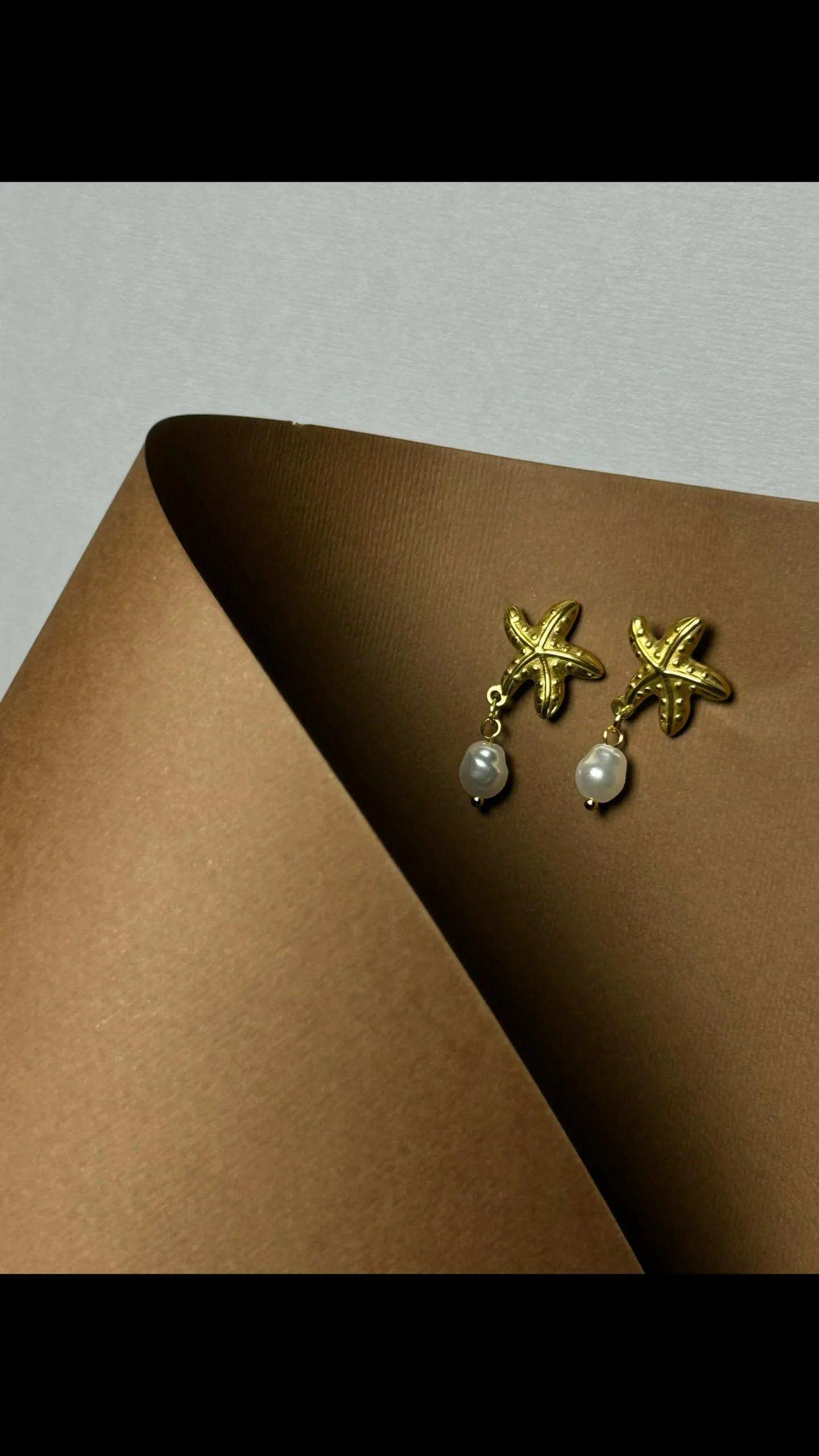 أقراط على شكل نجمة بحر بلمسة ذهبية فاخرة، تتدلى منها لؤلؤة ناعمة تضيف أنوثة ورقيًا لكل إطلالة.
